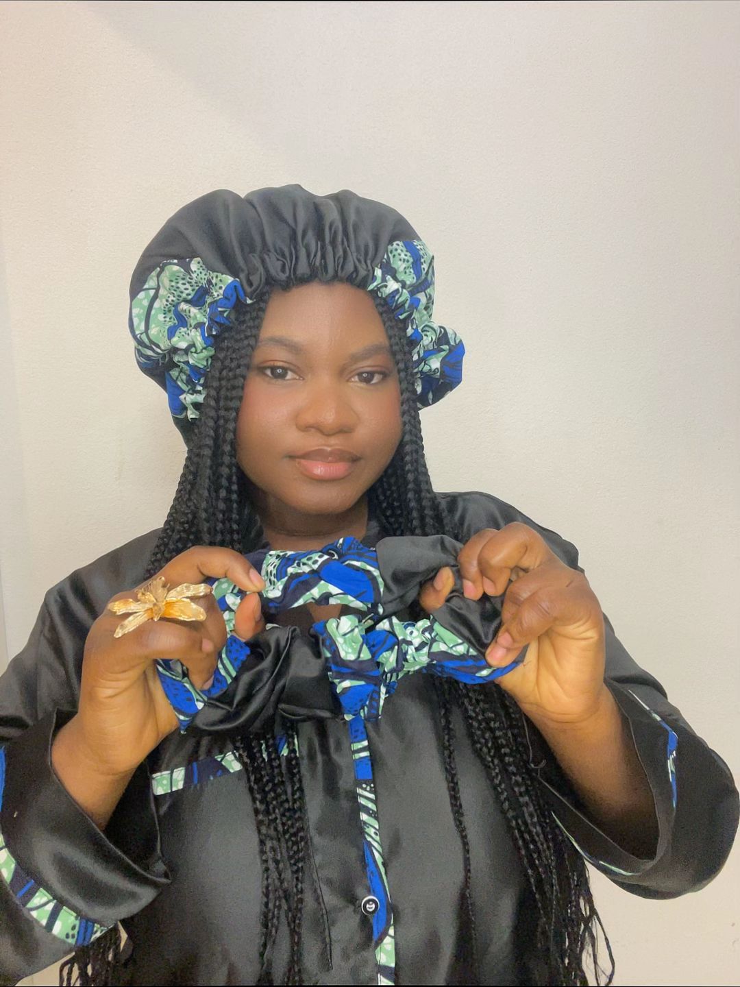 Offrez à vos cheveux douceur et style avec ce duo parfait : un bonnet en satin haut de gamme accompagné d’un chouchou assorti, sublimés par une touche délicate de tissu wax en coton, emblème du savoir-faire africain.